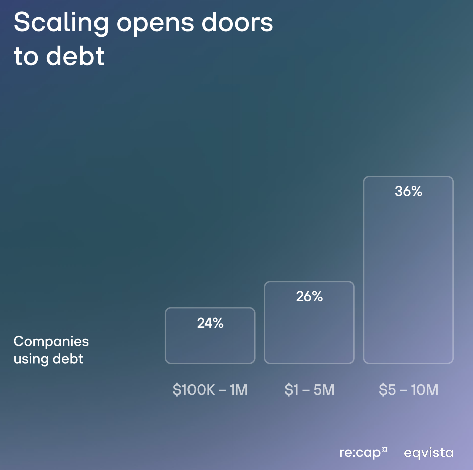 - Companies in the $100K–$1M bracket that utilized debt experienced slightly faster growth (35% CAGR compared to 34.2% overall).