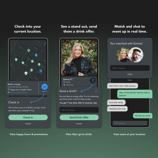Swivel does online dating differently. Within the app, a user can view their location on a map, check in to a venue, and match or send a drink offer to other users who are at the same venue or nearby. Compared to other dating apps, Swivel is sleek, refined, and dark. Beyond aesthetic reasons alone, Swivel’s dark mode is discrete and unassuming when used in a dim bar or cocktail lounge. The iconic Swivel barstool, cheeky cocktail imagery, and send a drink offer feature reinforce Swivel as the app you associate not with swiping, but with going out, meeting connections, and having valuable IRL experiences. With a predominantly women-led team, Swivel is ushering in a new era of dating and leaving the common pains of online dating in the past.