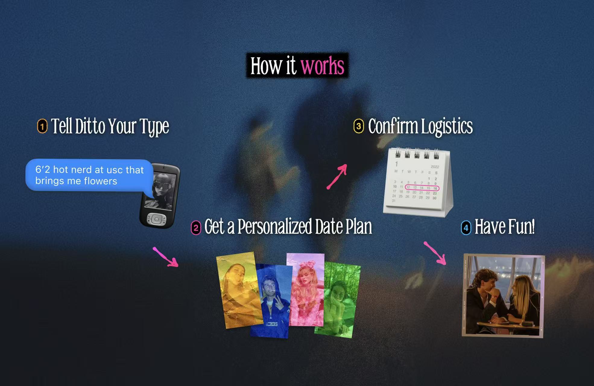 Ditto launched initially at UC San Diego and we went viral across sorority group chats and quickly expanded to UC Berkeley, USC, UCLA, and UC Davis.Ditto operates entirely over iMessage, where users already communicate daily. Users tell Ditto their preference for a date, such as ‘a 6 ‘2 hot nerd that brings me flowers’ or ‘an ABG who mastered leetcode’. After sharing their preferences and availability, users receive a text with a complete date plan, including the time, place, and details of their match, all centered around the campus they are near. After each date, Ditto collects feedback and incorporates these feedbacks into the user’s profile to improve future matches. The result is a system that feels personal, efficient, and low-pressure, while removing much of the anxiety and inefficiency associated with modern dating apps.