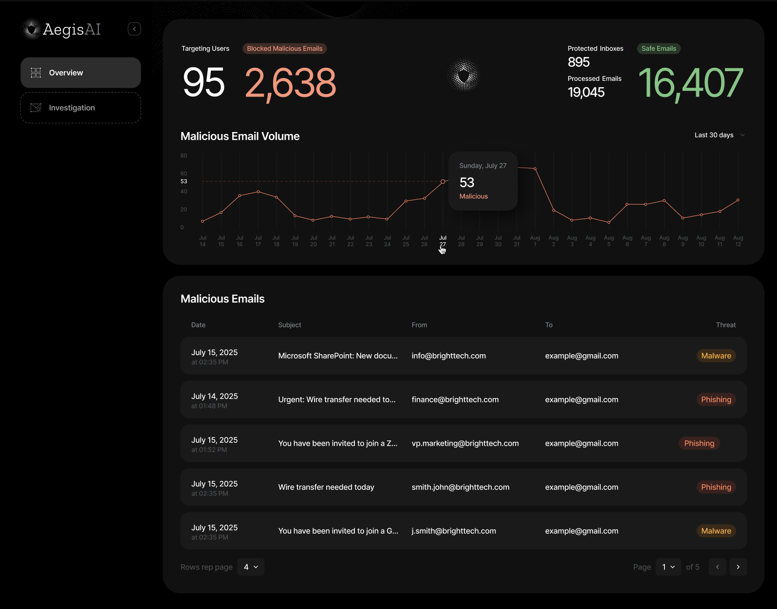 AegisAI autonomous AI agents eliminate Phishing, Malware, and Business Email Compromise (BEC) attacks before they reach user inboxes.