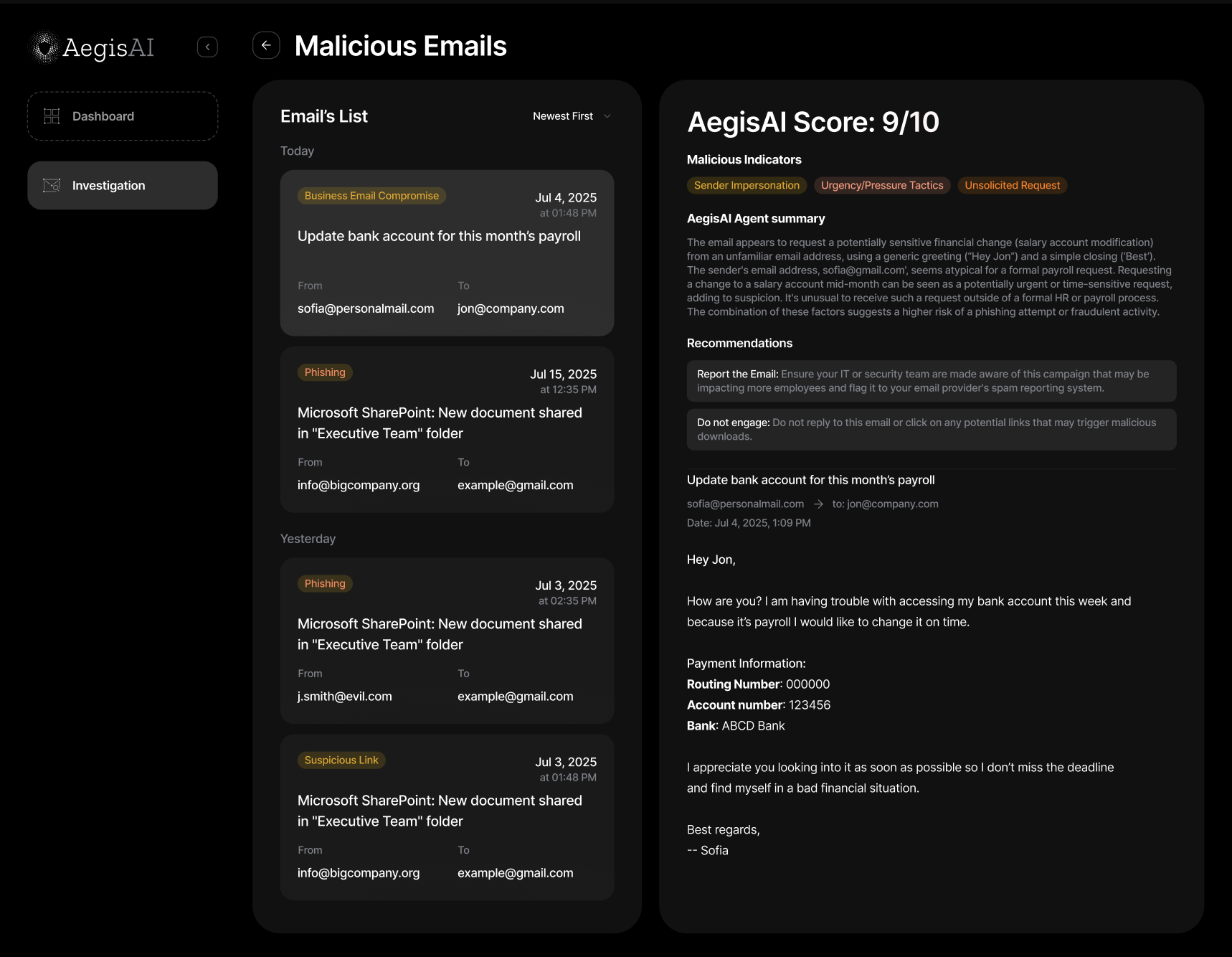 AegisAI is pioneering the next generation of email security through autonomous AI agents that detect and respond to email threats without human intervention. Founded by former Google engineers and product leaders with deep expertise in large-scale threat detection, the company delivers radically simplified and more accurate protection against phishing, malware, and social engineering attacks. AegisAI is backed by leading venture capital funds and angel investors. Learn more at https://aegisai.ai.