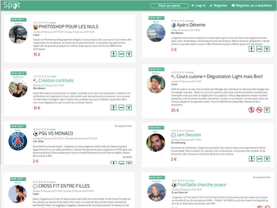 Come to my Spot propose ainsi aux utilisateurs d’organiser des événements chez eux contre une rémunération, ou de se déplacer chez d’autres particuliers pour se retrouver ensemble autour d’activités telles que :