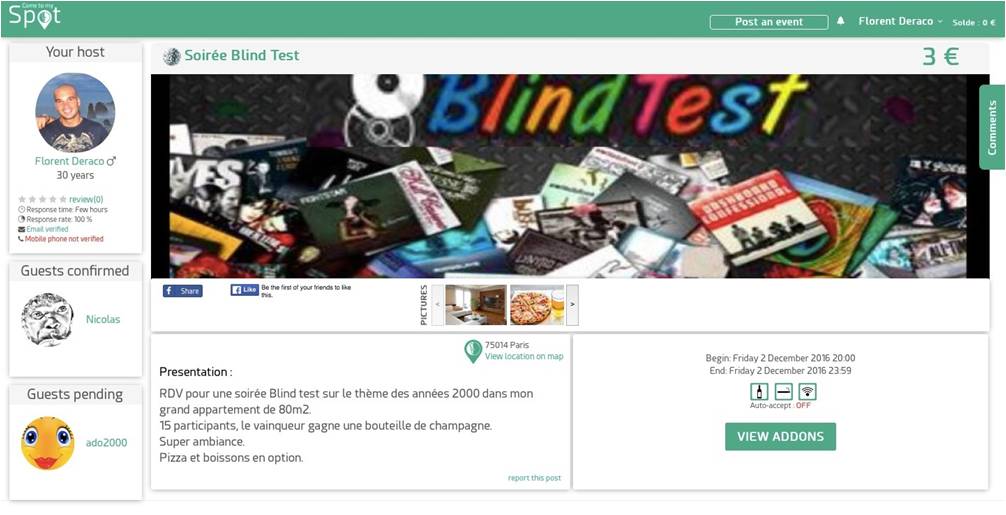 Lancé le 10 février 2017, Come To My Spot c’est un site web et une application mobile compatible IOS et Android permettant aux utilisateurs d’organiser des événements à leur domicile et de se retrouver autour de passions communes, tout en gagnant de l’argent.