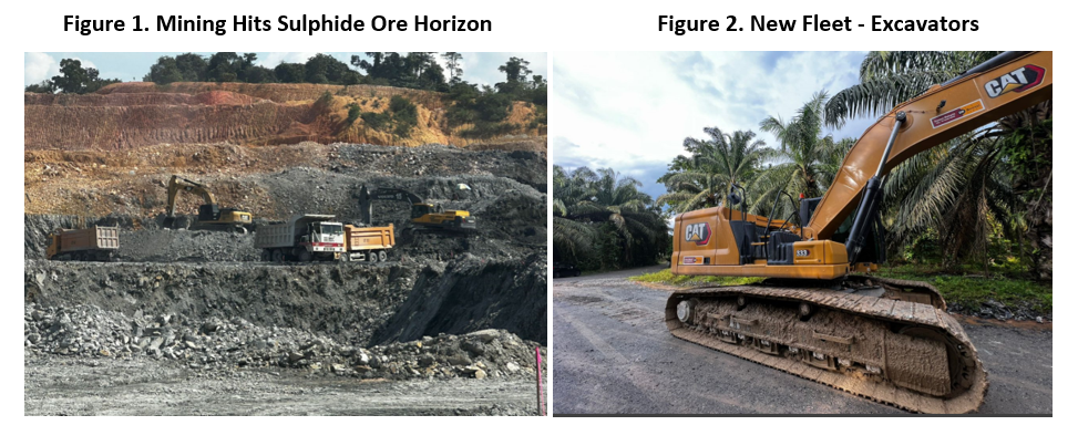 Le taux de production d’extraction minière actuelle se situe autour de 450 kBCM par mois et devrait augmenter à 500 kBCM par mois au cours des premières années de la durée de vie de cinq ans de la mine. L’objectif de l’exploitation minière est de répondre à la capacité maximale de l’usine de traitement (80 kt par mois), et de maintenir le stock de tout-venant (ROM) d’une production de 3 mois ou 240 kt de minerai sulfuré. À l’heure actuelle, il y a un stock de minerai sulfuré d’environ 75 kt, soit à peu près un mois d’approvisionnement pour l’usine de traitement.